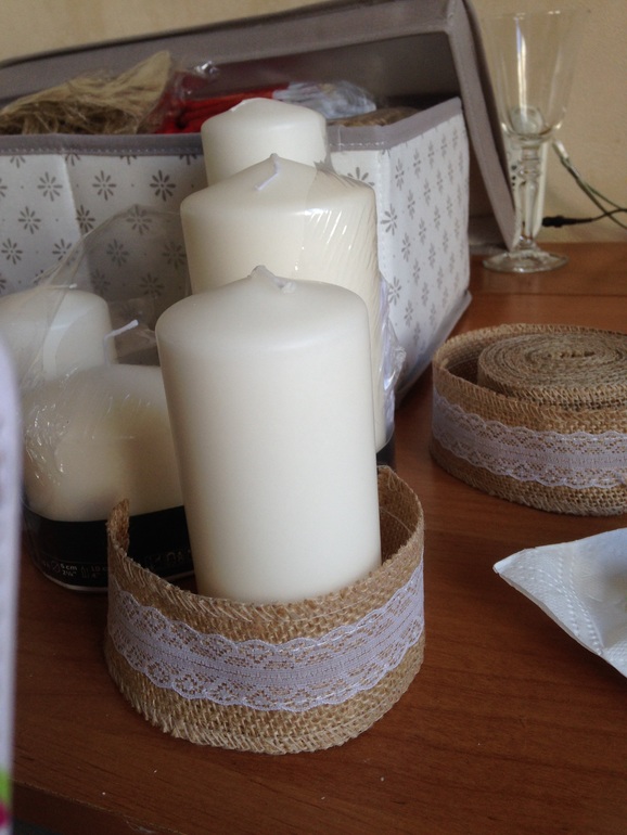 Я бы сдела ленты из мешковины внхлёст и друг на друга они и клеем каким-нибудь рукодельным приклеятся, типа ПВА, или сколоть-сшить между собой и натянуть на свечи. Про бокалы не поняла - куда жгут? На всякий случай предложу двусторонний прозрачный скотч. Со скотчем, кстати, и на свечах сработает - сначала скотч, который склеить внахлёст потуже, а на него ленту.