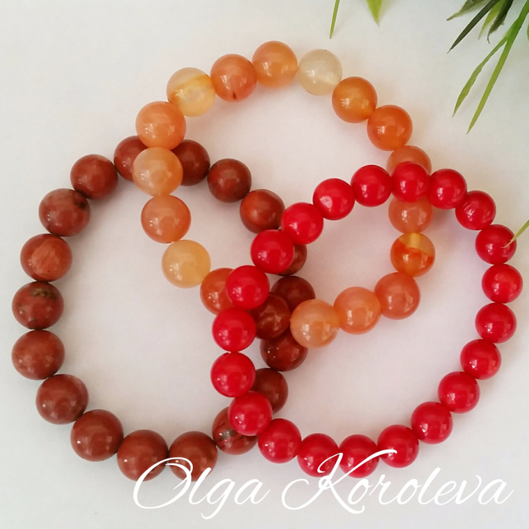 Очень теплый и по-настоящему осенний комплект браслетов из натурального коралла, красной яшмы и сердолика.
