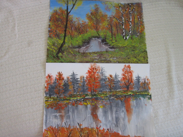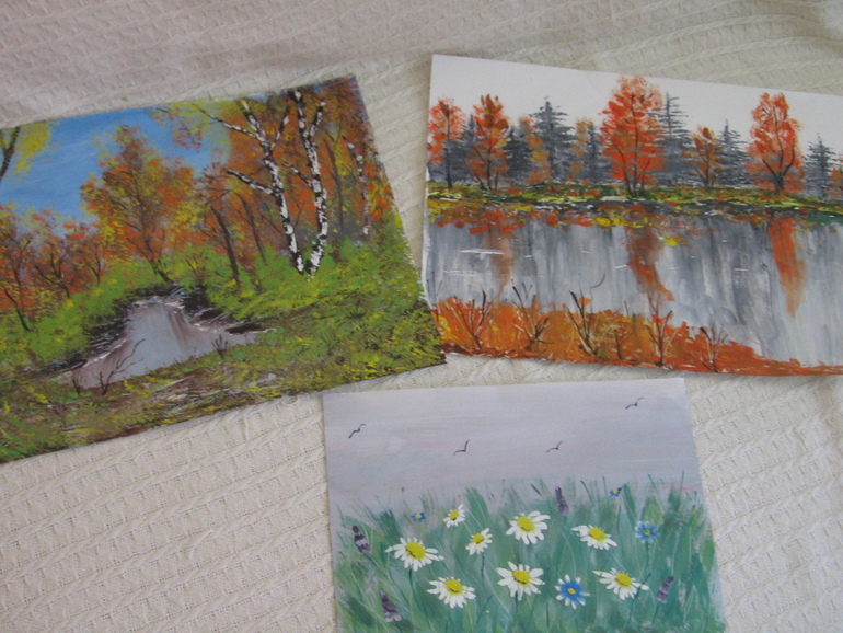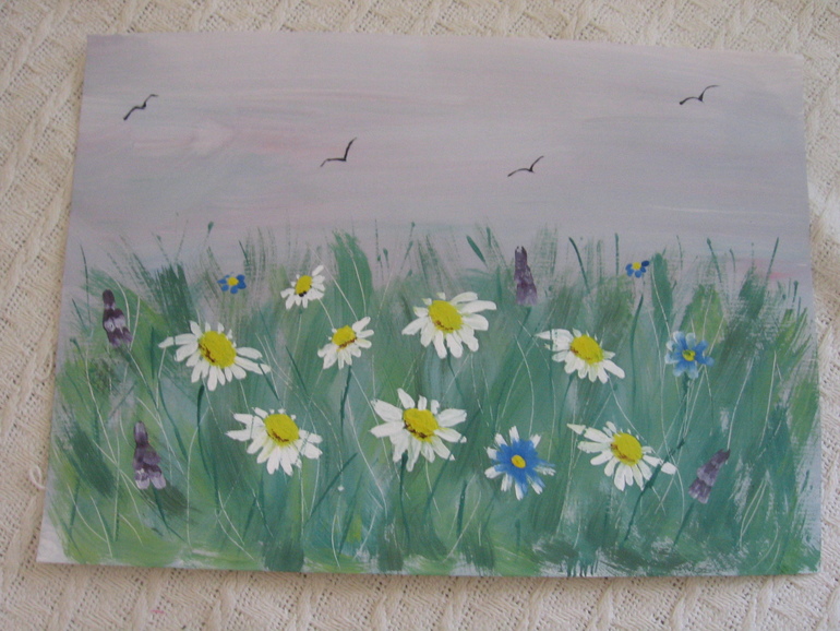 Какой в итоге решила нести? Мне больше нравится конечно с озером-лужей. Если претендуешь на победу, неси его. Если просто участие, то второй. А первый в рамку дома. Хотя, второй тоже красивый... Ромашки отлично получились!