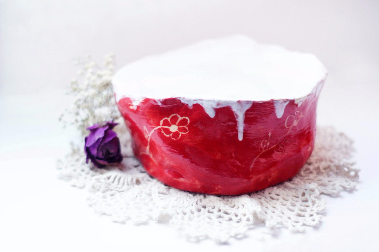 Необычно и со вкусом:) Я однажды попала на мастер-класс в гончарную на Крите, сделала чашу, на обжиг времени не было и она растрескалась в пути. Но ощещения от работы с глиной остались непередаваемые! Ты умничка!