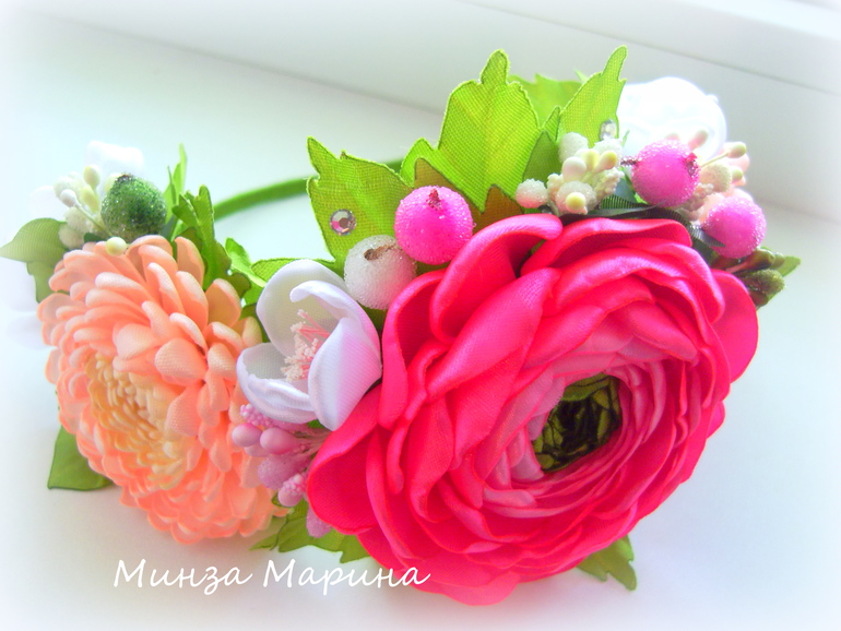 Ободок - ранункулюс с хризантемами - вот такое необычное сочетание получилось