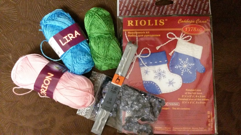 три моточка пряжи (начаты буквально 20 см), крючок, черные пайетки и новогодние игрушки.