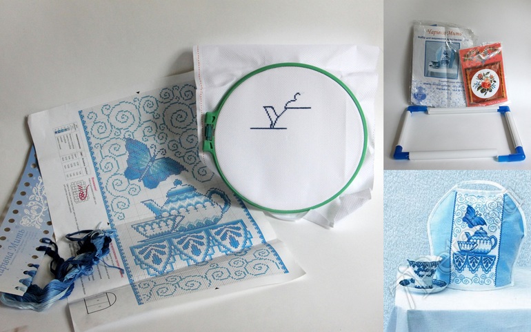 Вышивальный слон. Начатый набор "Чаривна мить" "Гжель, грелка". Канва, схема, нитки в органайзере. Начат мало, видно на фото.