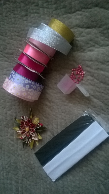 брошь ручная работа в технике канзаши, 2 повязки(заготовки), каждого цвета ленты представленной на фото по 2 метра, бусины 3-х цветов в коробочках