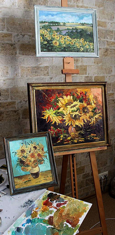Живопись, точечная росписьУшли от меня мои любимые вангоговские подсолнухи и я решила, что без подсолнухов остаться не могу! Все выходные рисовала... получилось три картины, совсем разные: