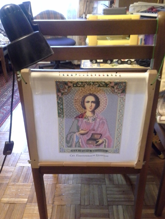 Рамку вешаю на стул за проволоку, которую приделала к дырочкам на раме и кладу на колени. Так немного одна рука получается свободна. К стулу прикрепляю лампу. А можно пользоваться налобным фонариком. Я так и делаю! Станок не нужен! Идея очень простая.