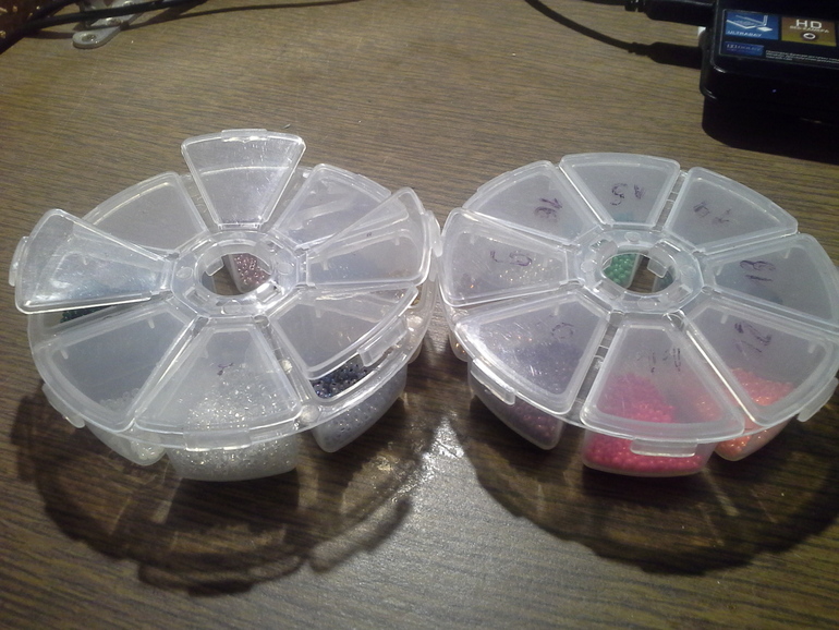 А храню бисер в таких вот контейнерах, вернее сказать, пользуюсь, а лежит бисер в простой коробке в пакетиках.