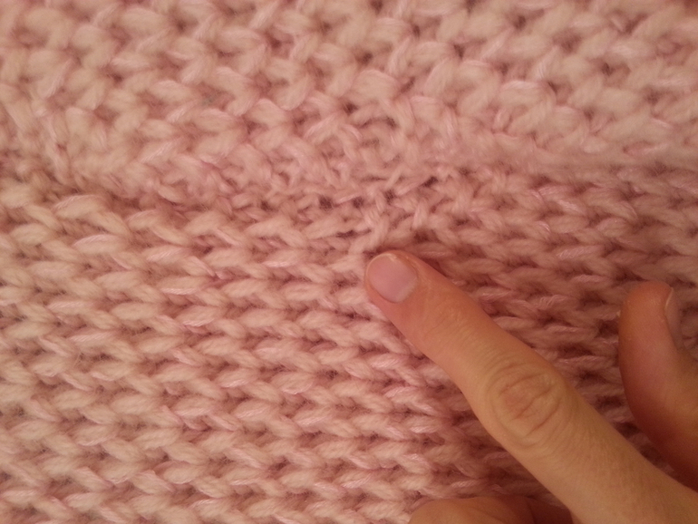Мне кажется, эту соту очень видно, попробую просто вручную нитку продеть, чтобы ее закрыть. Но если смотреться не будет, мне уже плевать, буду так ходить. Я столько раз все перевязывала, что больше не могу :)