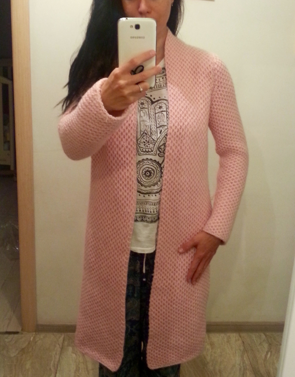 И еще такой момент - я вязала двойной шерстяной нитью плюс одна нить бамбуковая. Получилось реальное теплое пальто. Буду делать к нему крючки и хочу подкладку. Кто-нибудь знает, где в Москве можно купить розовую подкладочную ткань?