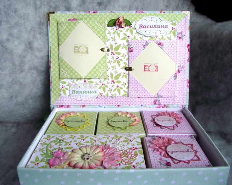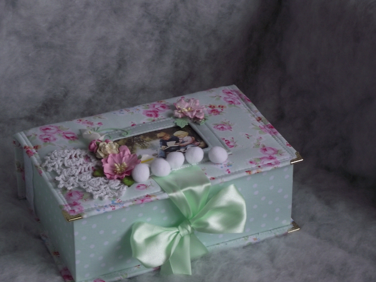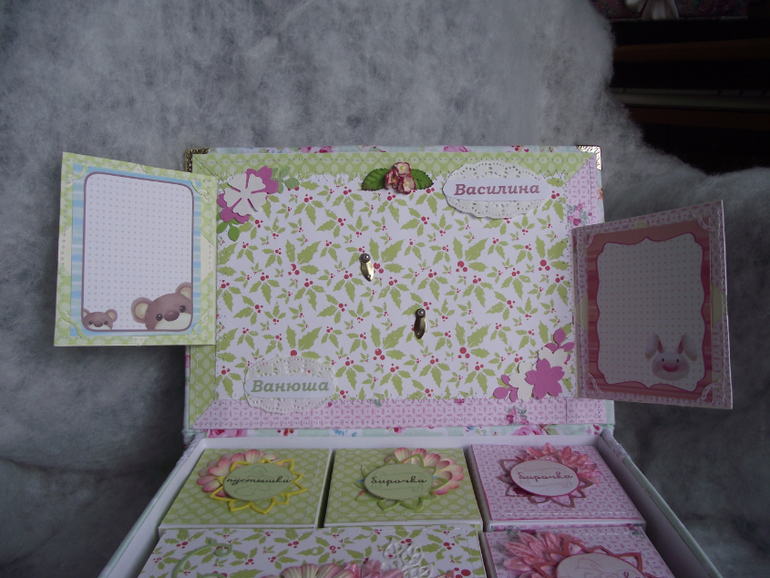 Хочу показать вам новую "Сокровищницу" для мамы двух деток: сына и дочки. Основа - переплетный картон, проложена для мягкости и обтянута хлопком. Картинка на крышке вынимается и можно вставить фото.
