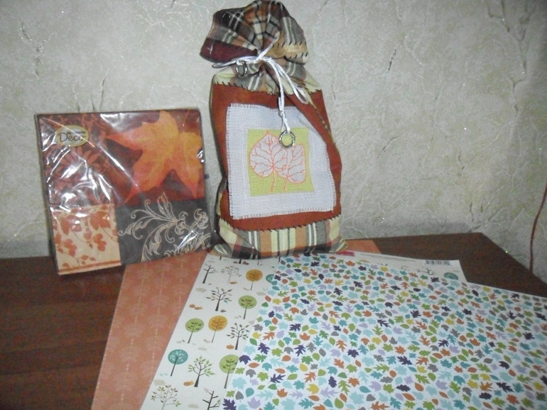 И в продолжении темы игры, когда все подарочки были собраны, мне приспичило сшить еще мешочек к слову "листопад", фото мешочка не сделала, так как спешила отправить, поэтому даю фото с самой игры сделанное Дарьей.
