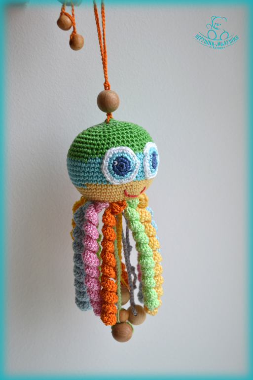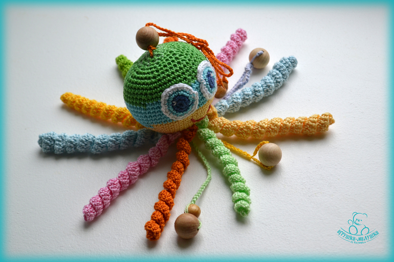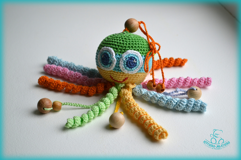 Осьминожка-погремушка связан из 100% хлопковых ниточек (Бегония, Лили), головка плотненько набита гипоаллергенным холофайбером, в центр вставлен контейнер от киндера, наполненный бусинками и звенелками, приятно грохочет, также на осьминожке имеются можжевеловые бусины, которые можно грызть или же перебирать маленькими ручками))