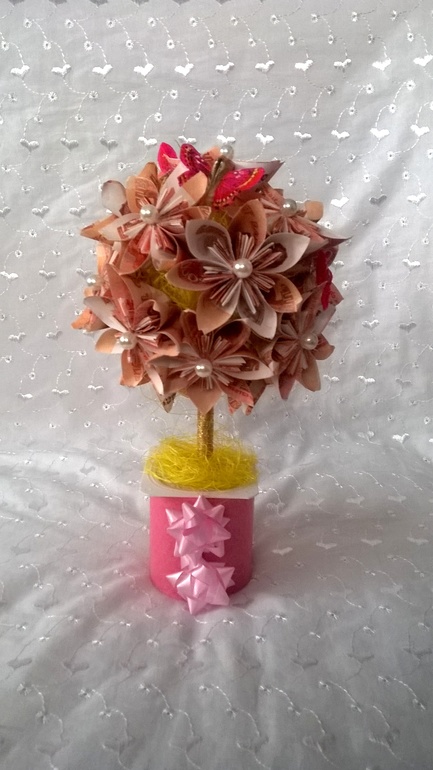 Девочки, всем привет! :-) Давно хотела смастерить интерьерное денежное деревце, но что-то руки всё не доходили! Недавно всё же решилась! Делала медленно, кропотливо, аккуратно...лепесточек за лепесточком...цветочек за цветочком...! :-) Так увлекло всё это дело, что вместо одного топиарчика сделала два! :-)