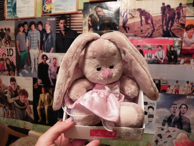 Забрали мы посылку еще днем. Я ее конечно же вскрыла пока муж меня довозил до работы. Но увидела только зайку и красивущую сумочку. Схватила их и пошла хвастаться. Еле дождалась мужа с работы.