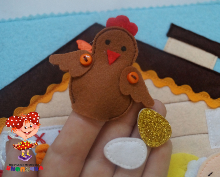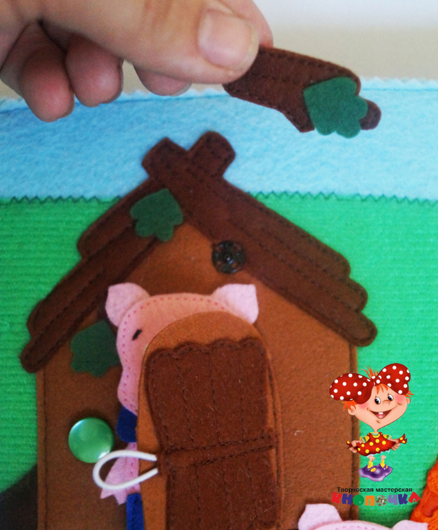 У каждого домика открываются/закрываются дверцы на пуговички. Также снимаются элементы домов из которых поросята строили домики (солома, хворост, кирпич), они крепятся на кнопки. Сами поросята и вол на липучках, также являются пальчиковым театром, домики тоже на липучках, чтобы их мог сдуть волк по сценарию сказки.