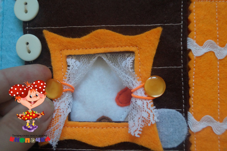 Справа расположен сам теремок. Все окошечки застегиваются/расстегиваются на пуговицах. В крыше есть кармашек для медведя. Внизу на кустике есть перетяжка цветочек-бабочка, под травкой прячется божья коровка. Нам очень нравится играть в "Ку-ку" с ними ))
