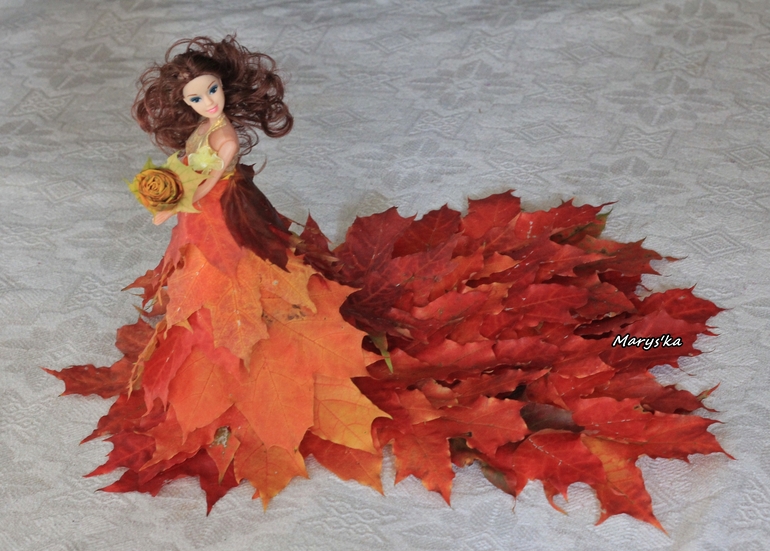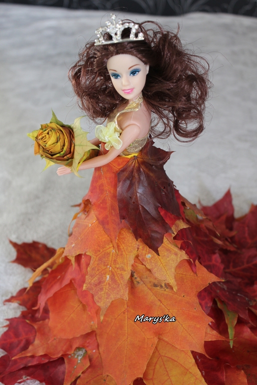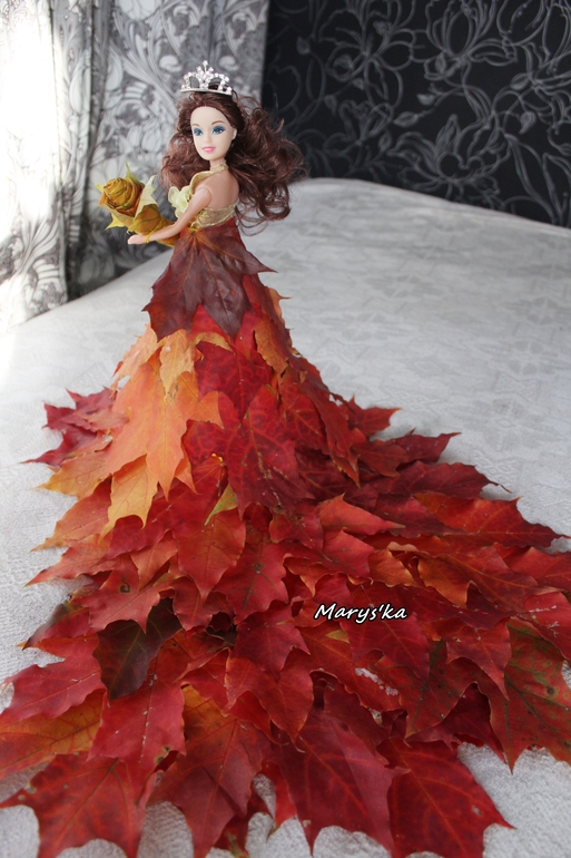 Из картона сделала каркас, закрепила на кукле. Сшила (это громко сказано!) юбку со шлейфом