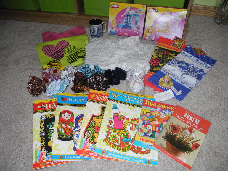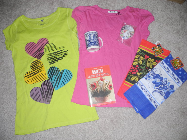 Mне много нужностей - хлопковьіе футболочки, буду носить после рождения мальіша уже))) Сейчас не влезу))) Полотенчики гжель и хохлома, красивьіе стразики для ногтей, так как я люблю делать дома себе и подружкам ноготочки с шеллаком и украшаю их. Кружечка с росписью гжель и городом Волгоград, а также очень красивьій журнал по вязанию цветов крючком. Будет у меня больше времени, обязательно что то свяжу.