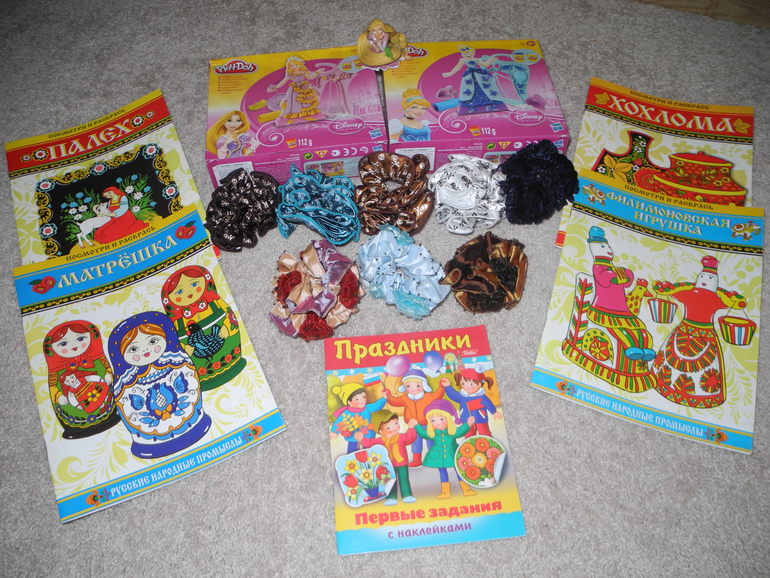 Ну и дочке, как всегда, угодила)) Она безумно любит плейдо, лепит каждьій день почти, наборьі, а тут еще и с принцессами, которьіх она обожает. Вот радости то будет! За резиночки для волос отдельное спасибо, много красивьіх, будем делиться с дочкой)) Еще Рапунзель фигурка, Катя любит такие штучки тоже)) Много расскрасок, тоже вечерами любит красками порисоавать, вот как раз будет на чем.