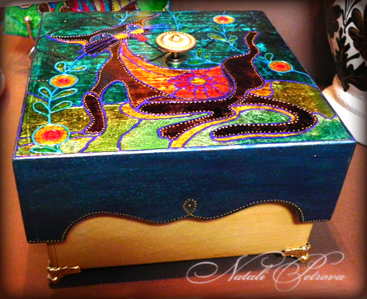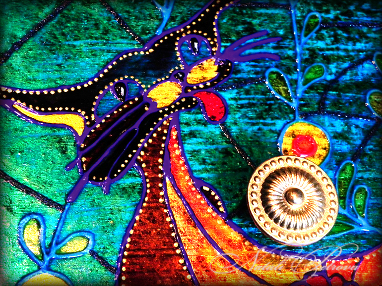 Декупажем тут и не пахнет. Технология такая: поталь, защитный лак, прорисовка контурами, заливка витражными красками.
