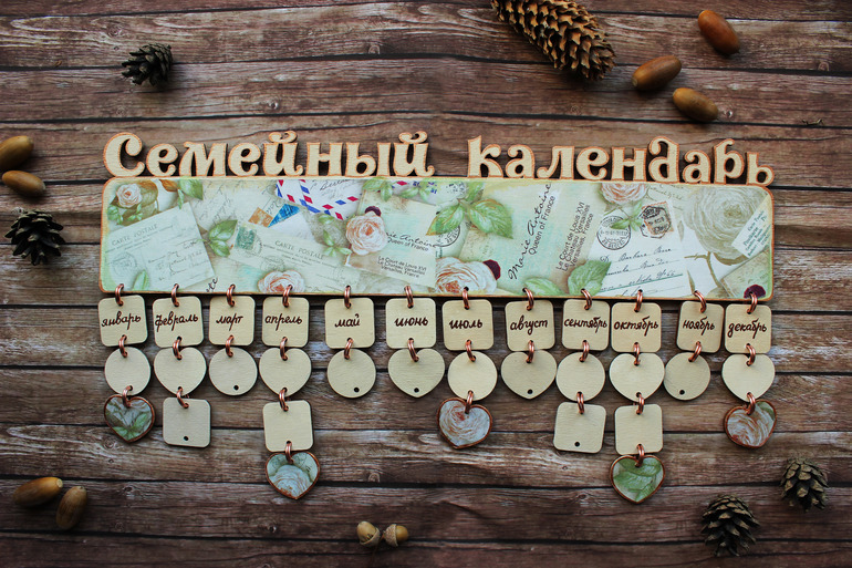 ДекупажХочу показать новый семейный календарь, в этот раз на светлой основе, а не в цвет дерева. Давно ждали своего часа перламутровые краски, в этом календаре удалось одну из них использовать, подчеркнуть детали.