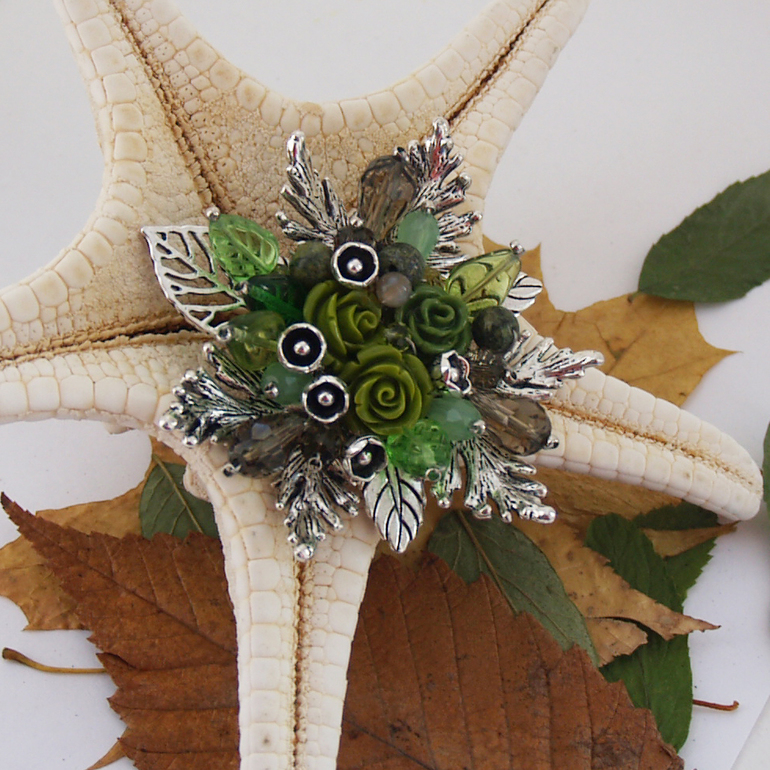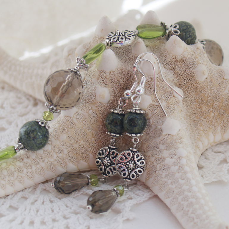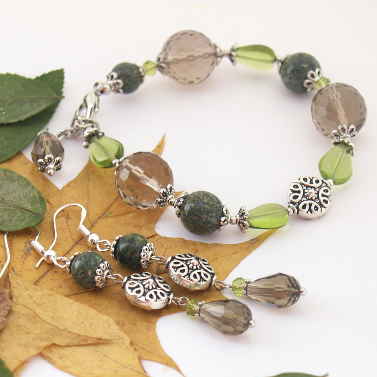 Комплект собран из бусин раухтопаза, змеевика, чешских листиков и металлофурнитуры.