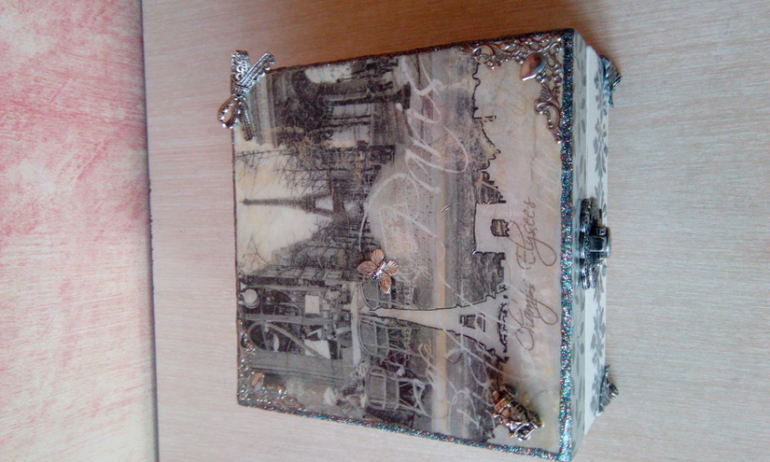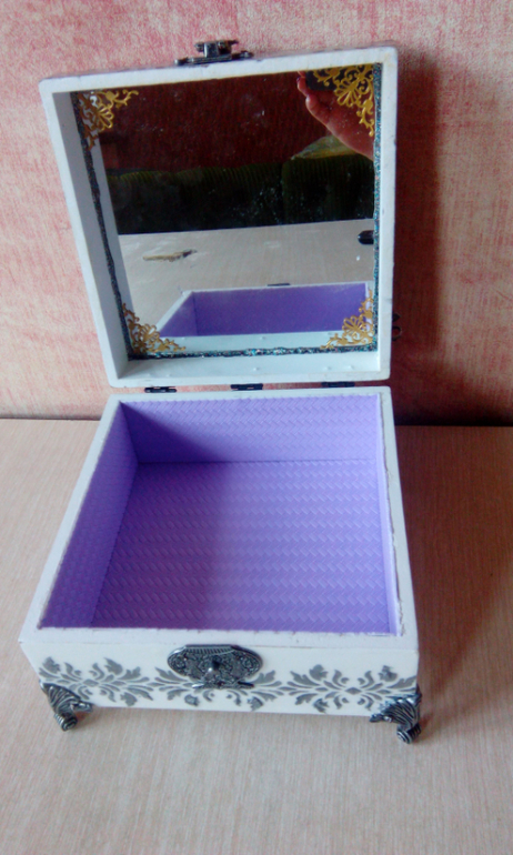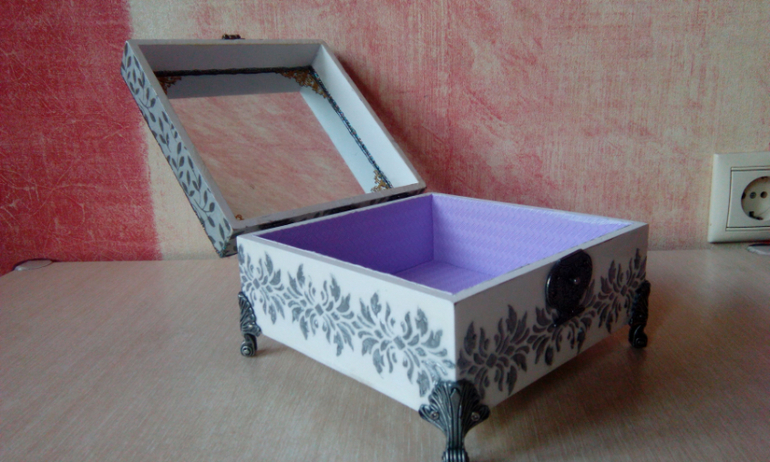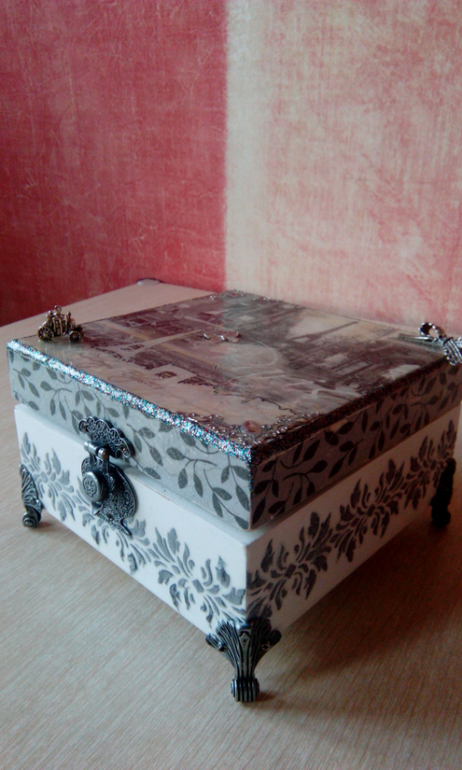 долго делалась, много переделывалось, в итоге вот такое вышло. внутри - не помню точно, кажется пластичная замша (просто понравился в маазине) называется материал. металлическая фурнитура и финишное покрытие стекловидным лаком боковины и верх эпоксидная смола.