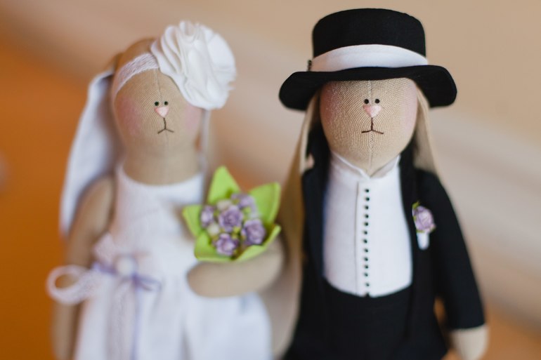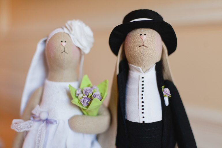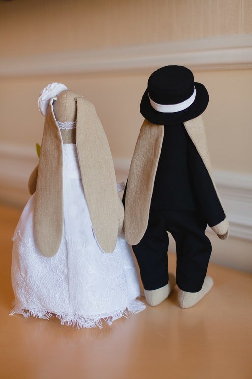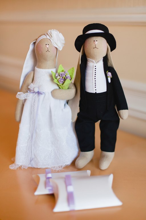 Зайки получились ростом 30 см., ножки и ручки подвижные. Костюмы тоже сшиты со всей ответственностью. У невесты платье из итальянского батиста и французского кружева, нежнейшие шелковые ленты, на ножке подвязка. У жениха костюм из итальянской костюмной вискозы. Сама заек не успела сфотографировать (дошивала уже чуть ли не поезде, потому что первой частью подарка были лоскутные подушке в бело-сиреневой гамме), но они поучаствовали в свадебной фотосесии и теперь у меня есть несколько фото красавчиков.