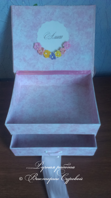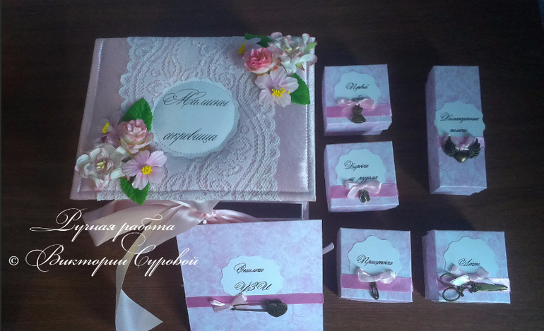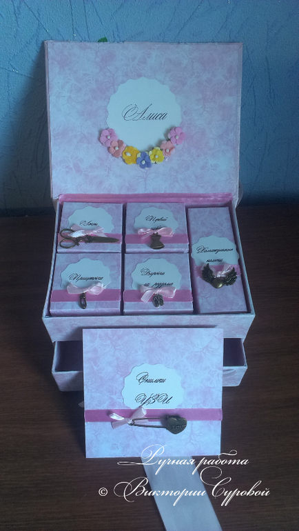 Внутри 5 коробочек и конвертик для снимков УЗИ. на коробочках ленточки и подвесочки. внутри на крышке имя малышки с цветочками.![]()
