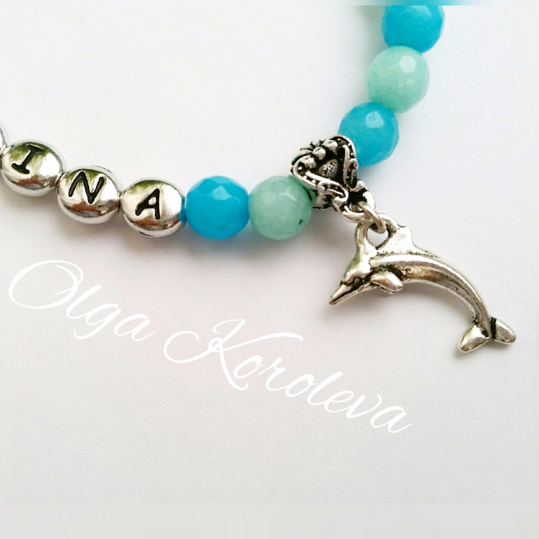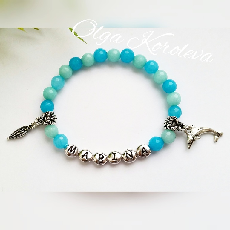 Бижутерия для слингомам. Слингобусы. Грызунки.Это самый мой любимый браслет с именем: тонированный агат цветов морской волны, морская тематика подвесок и очаровательные изящные бейлы.