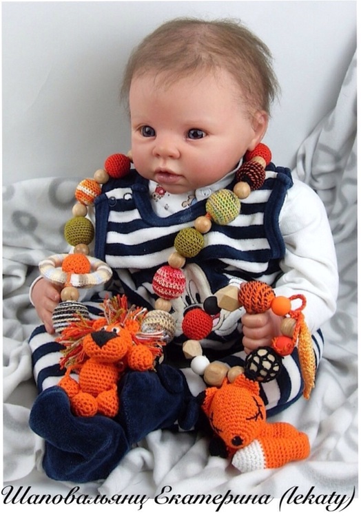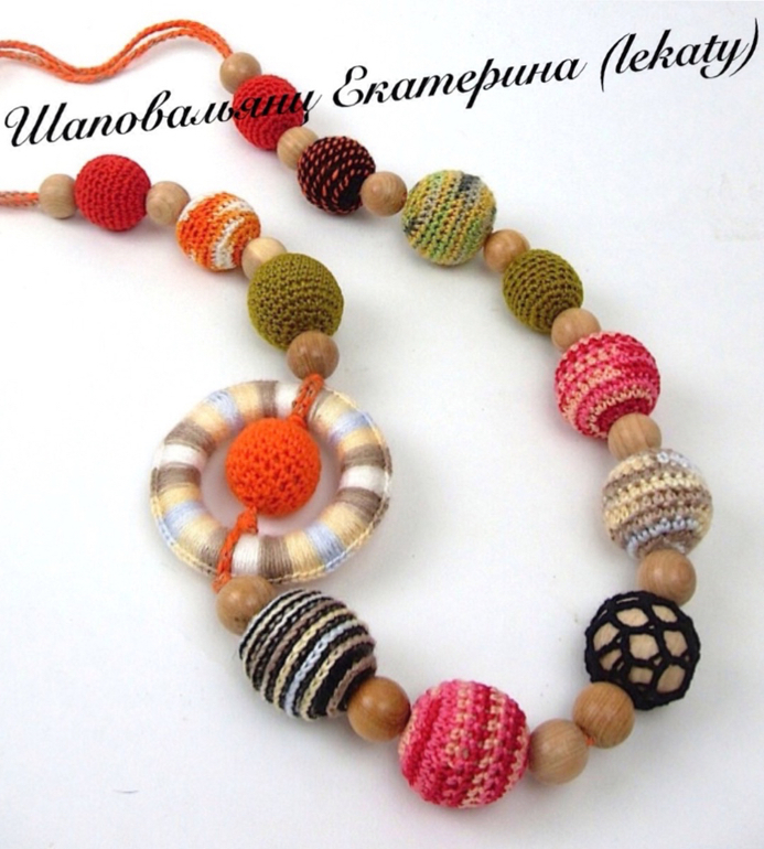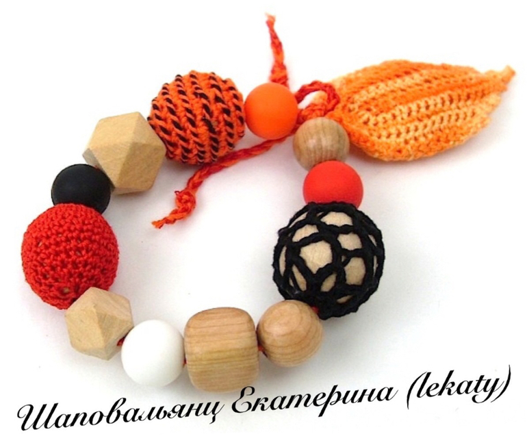 В бусах и грызунке использованы различные виды обвязки бусин, разные формы, размеры и материалы, для большей стимуляции развития мелкой моторики. В игрушках спрятаны погремушки, для стимуляции звуковосприятия, в игрушках имеются и твердые элементы ( обвязанные деревянные бусинки) и мягкие, в грызунке имеются силиконовые бусины и шуршащий листочек, в бусах и грызунке обвязаные и не обвязанные бусины, что даст представление малышу уже с самых ранних пор о разности материалов. В общем получилась палочка-выручалочка для мамы и увлекательные развивающие игрушки для малыша)))