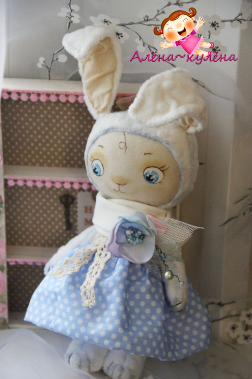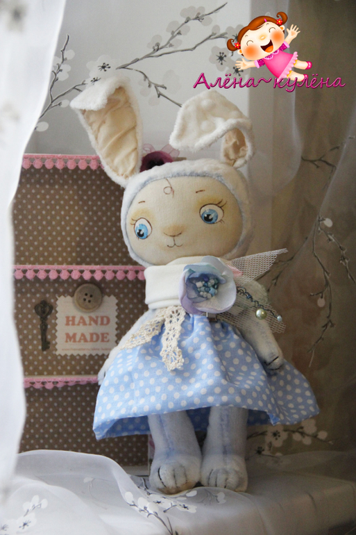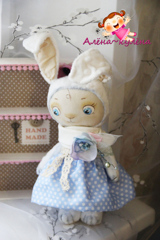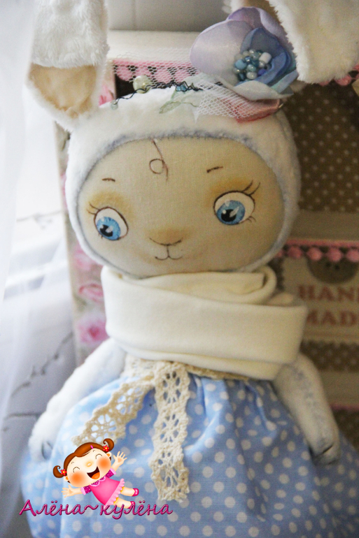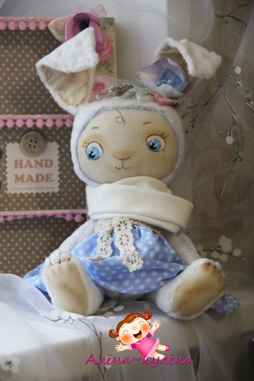 На заказ придумалась и сшилась вот такая зайка-малышка...рост 23 см без ушек, мордочка тонированная бязь и акриловые краски, сама зайка - из мягонького плюша минки, наполнена синтепухом и любовью...