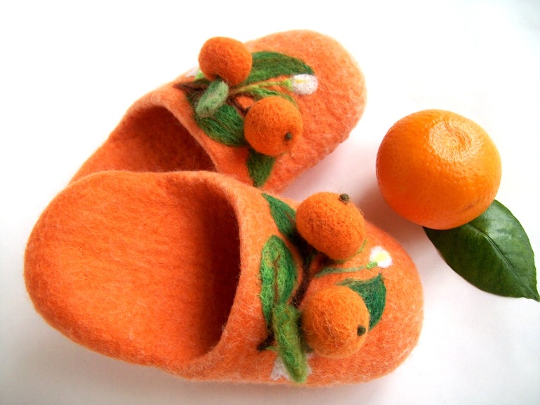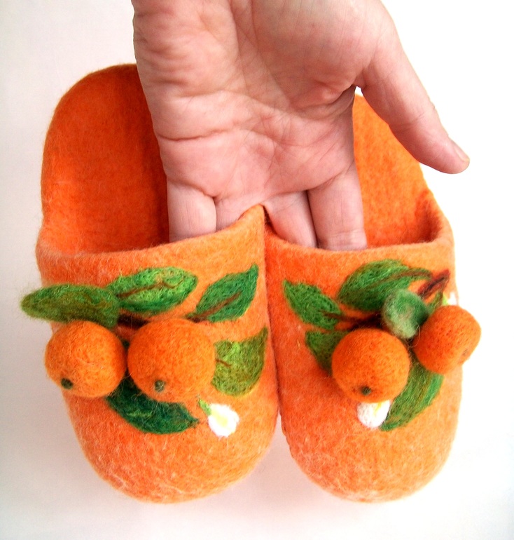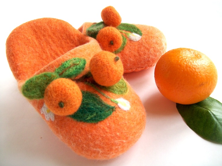 Мандаринчики сваляны по-сухому, рисунок привалян к тапочкам в такой же технике.