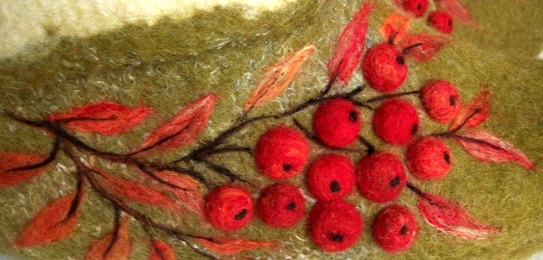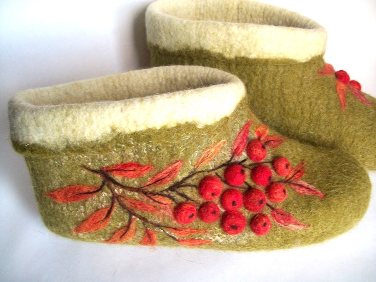 Шерсть мягкая, внутренняя поверхность тапочек - из натуральной не крашеной овечьей шерсти. Ягодки и листики - тоже шерстяные, рисунок создан в технике сухого валяния.