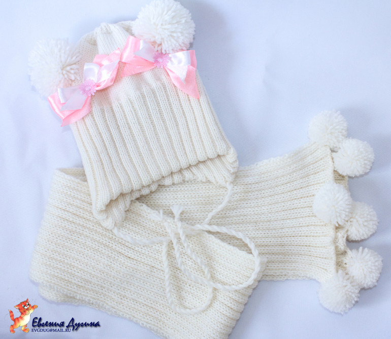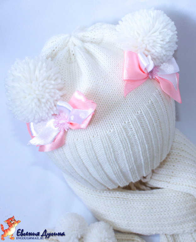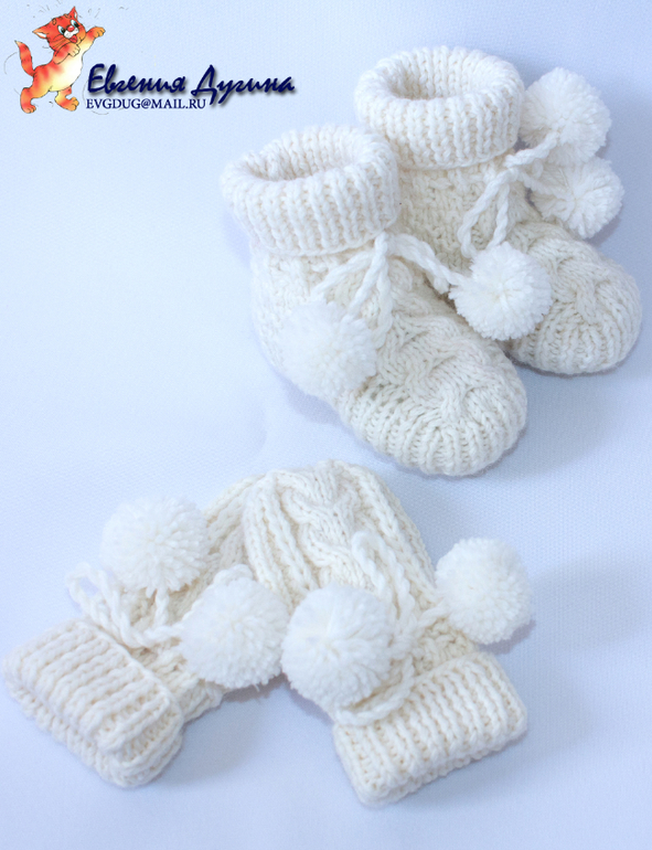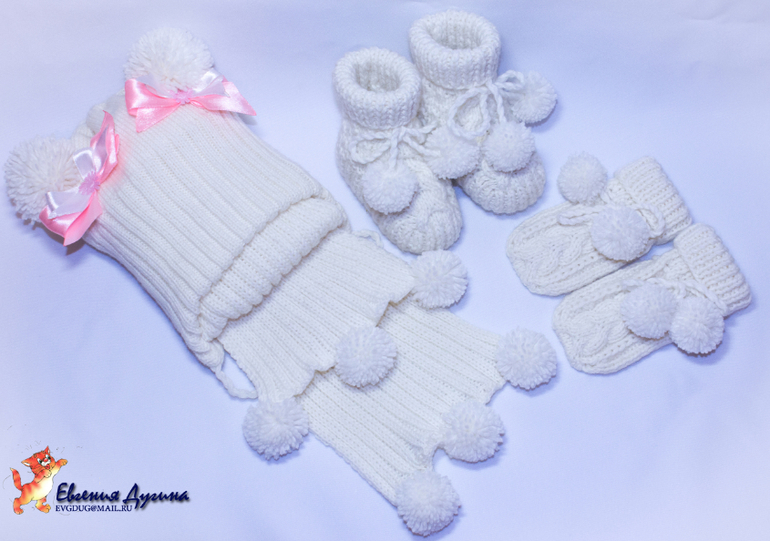 Связала комплект для малышки трех месяцев от роду) Думала в какую категорию отнести и отправила в "вязание спицами", потому что с варежками и пинетками возилась дольше, чем с шапкой и шарфиком)