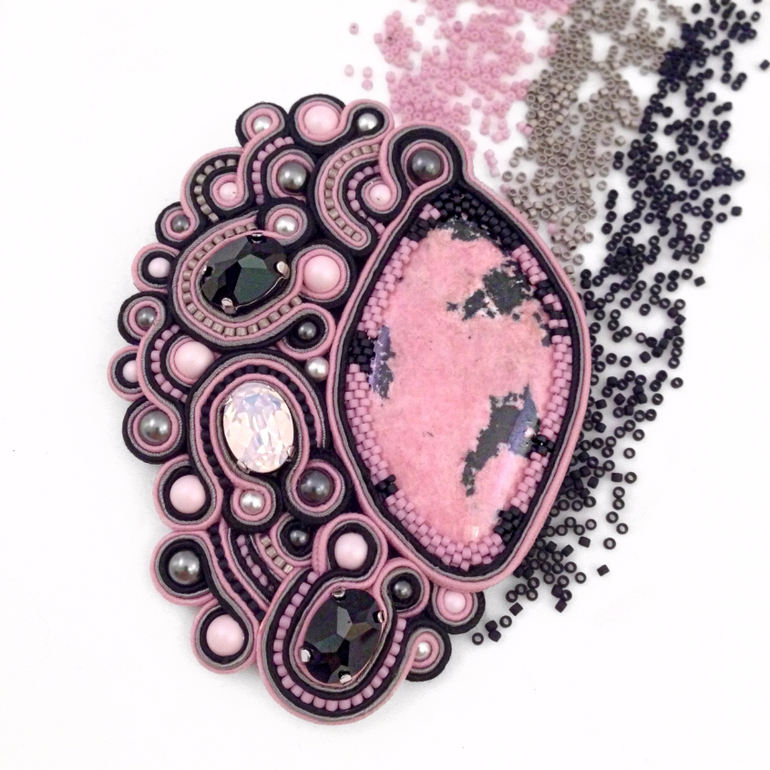 Большая брошь с родонитом, кристаллами и жемчугом Swarovski «Опалённые Мечты» в сутажной технике