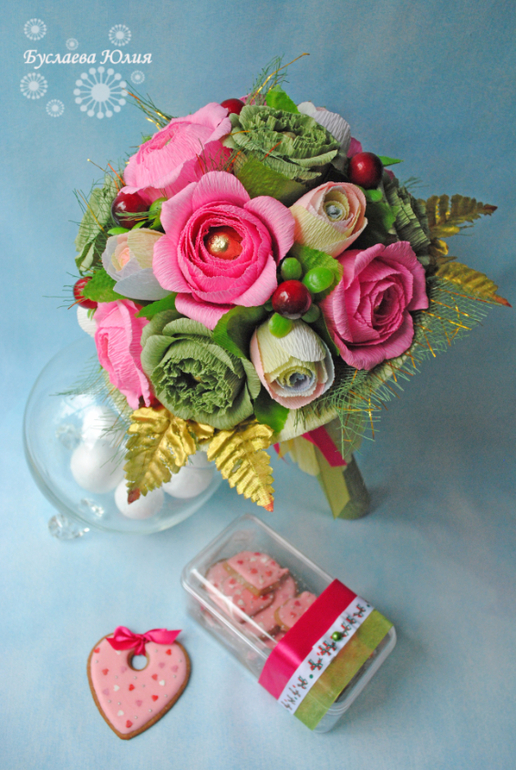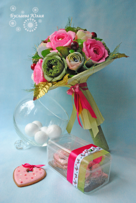 Совершенно неожиданно сложился набор из букета и пряничков. Ну, значит, так ему и быть. Букет сделан первым и лежал себе на полочке, ждал фотосессии. А тут и прянички подоспели, приложила я букет к коробочке пряничков, а они в одной цветовой гамме оказывается. Видно настроение у меня сейчас яркое фуксийное.