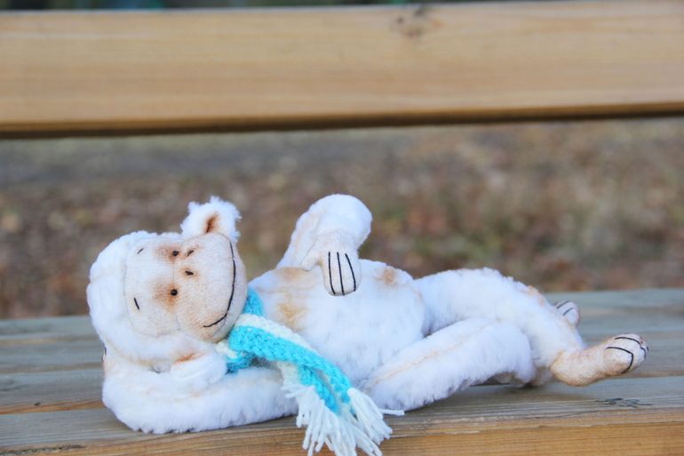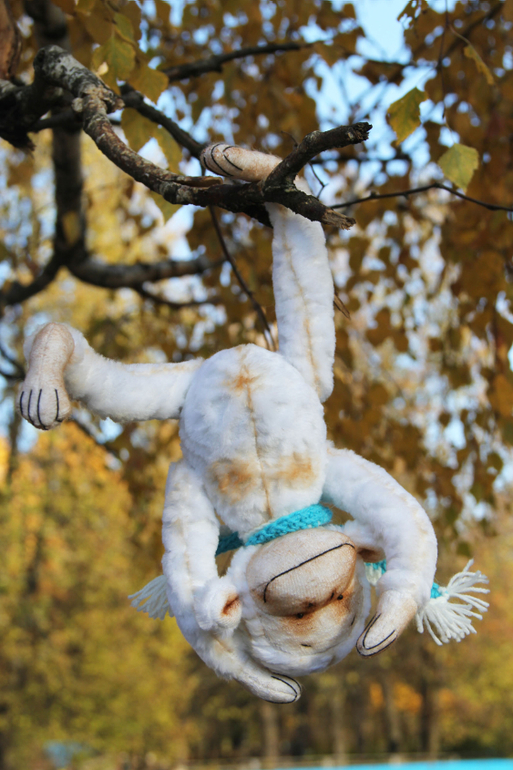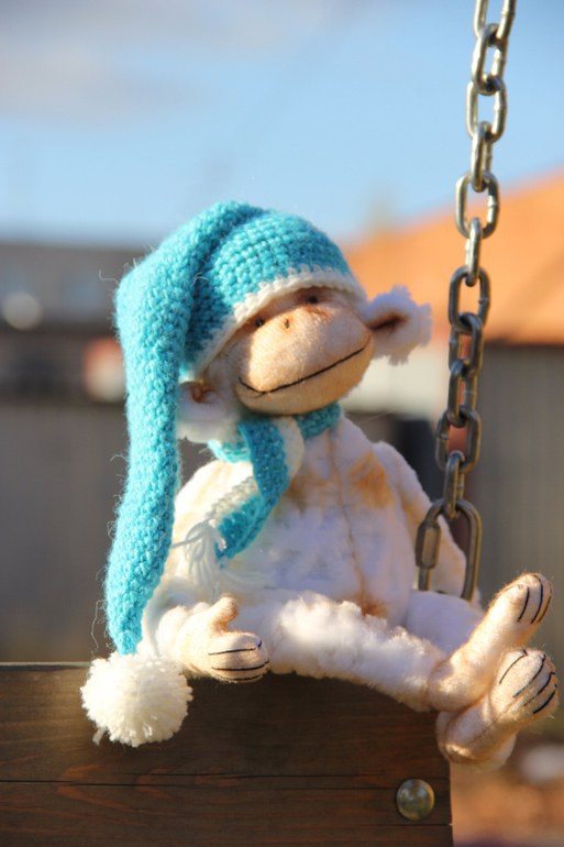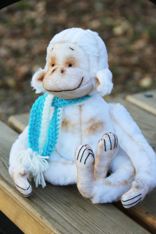 Игрушечный мир - животныеДостался мне по обмену красивенький белый мех (спасибо, Тамаре), обезьян не заставил долго ждать...30 см ростом, ручки-ножки гнуться как хочешь, внутри синтепух и стеклянный гранулят...6-ти шплинтовое соединение, тонирован масляными красками... климат у нас суровый....ни тебе пальм, ни бананов...потому носит шапку и шарфик...