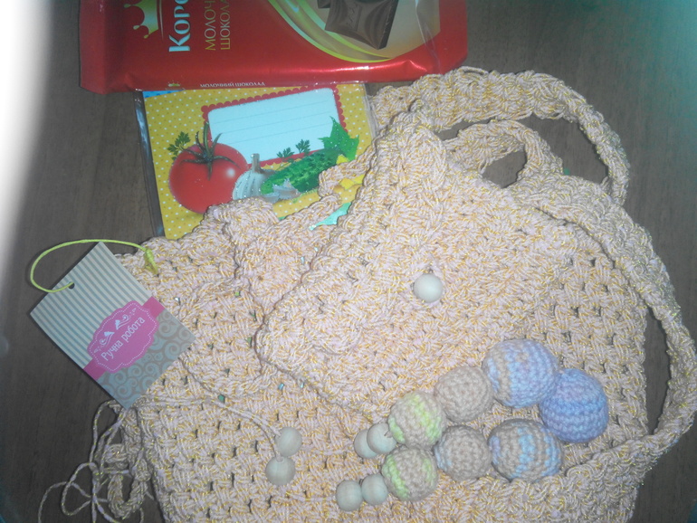 Девчонки мои в восторге! Правда, разделили между собой сумочки не так, как я предполагала))) Бусики - вообще моя давнишняя мечта! Очень нежный комплектик! Обалденный цвет!!! Прекрасное исполнение!) Тёплое пожелание на бирочке... + сладость и наклейки на крышки/банки (как раз мои израсходовались!) Спасибо огромное, Юленька! Столько приятных эмоций!!!