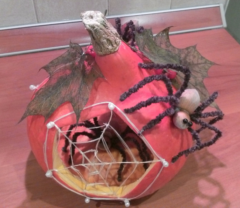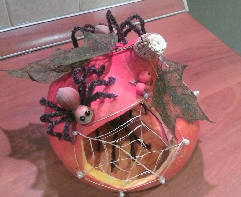 Тыква с пауками просто отпад!!! Понятно, что большая часть - это работа мамы. И все это понимают. Но, наверное, сегодняшнее время загоняет нас всех в такие рамки. И, всё таки это не поделка детей, а детей с родителями. И тут тоже прослеживается, как родители себя проявят: так себе или проявят столько фантазии и умения, как Вы. А, как ребёнок горд за такие поделки!!! Ещё раз повторюсь, что получилось очень здорово! Жалко, что тыква сгниёт... Или Вы её как-то, чем-то обработали??? Но отдать должное, что и Кирюшина картина получилась очень красивая! Молодцы вместе!!!