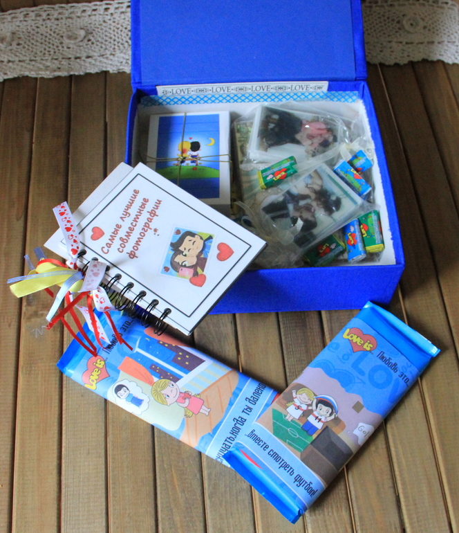 Такие вот шоколадки, конфетки с картинками Love is, альбом в той же теме с нашими фото и милыми подписями. Собственно жвачки и мыло с картинкой - нашими фото.