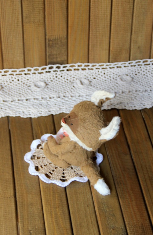 Как водится, набит опилками, утяжелен, немного состарен и тонирован чаем. Выкройка моя, ленты шелковые.