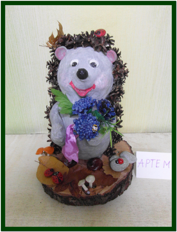 Поделки с детками.Осень-золотая пора поделок из природных материалов. Мы с ребенком не можем мимо пройти какого-нибудь красивого листочка, цветка . В этом году пришлось пополнять запасы. Вот и к очередной выставке в детском саду сделали такого ежика ( в саду дети ЕЁ назвали ИГОЛОЧКА). Идею иголок из шишек взяла из интернета, но захотелось усложнить. поэтому в голову пришла мысль: а почему бы туловище не сделать из глины. Задумано-исполнено. Я так увлеклась процессом наклейки шишек, что ребенку ничего не досталось .Но он честно сделал грибочки, божьих коровок из гальки и цветы из шишек.