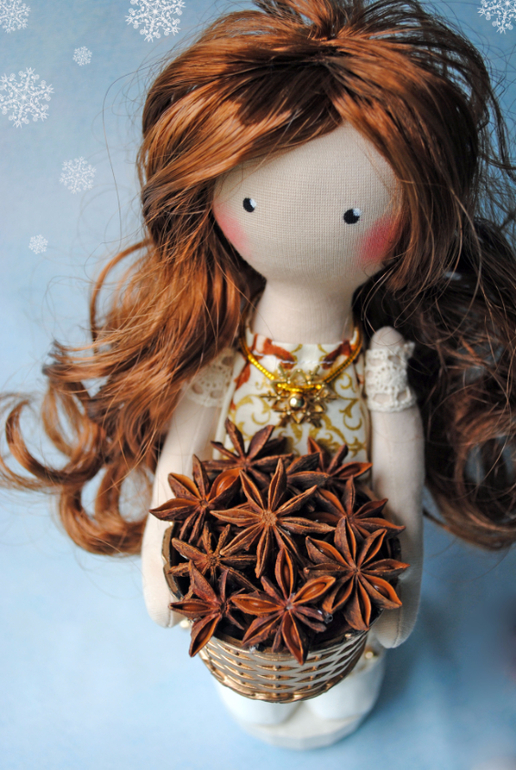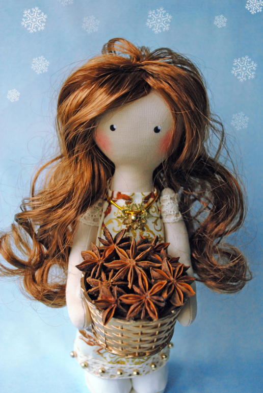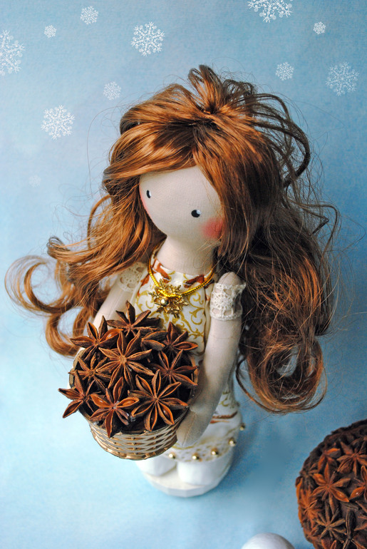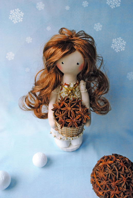 Захотелось мне спокойной цветовой гаммы и вот какая девочка у меня получилась. Правда не обошлось без золотого новогоднего декора. И ещё вручила я ей корзинку с анисовыми звёздочками, так что она теперь ароматная.