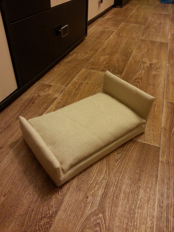 Далее диван. Каркас из фанеры, обшит синтепоном и обтянут мебельной тканью. Подушечки подбирала с розами под обои в гостиной. Сами обои из упаковочной бумаги для цветов, купила в цветочном киоске(как и обои для спальни и кухни).