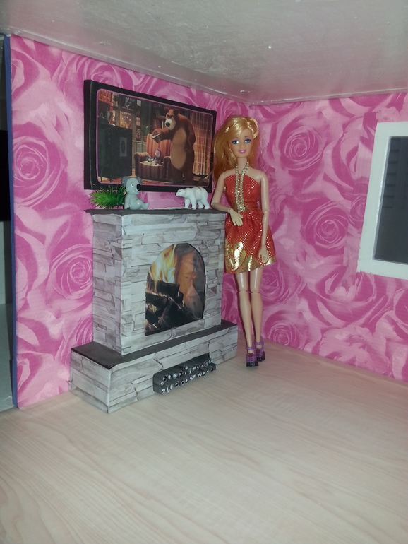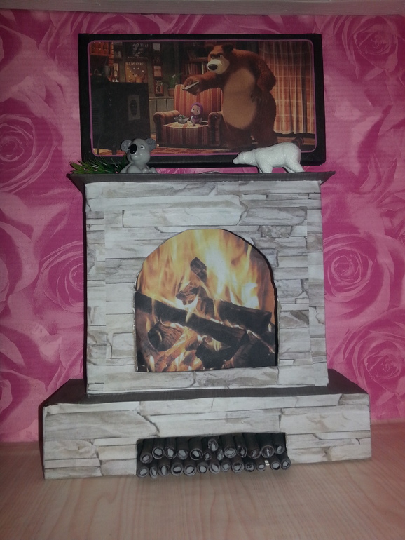 А это уже готовый вариант, обклеенный бумагой. Внутри камина огонь тоже бумажный. Просто распечатанный огонь вклеила полукругом в нишу камина. Дрова так же бумашные рулончики.