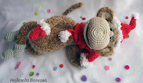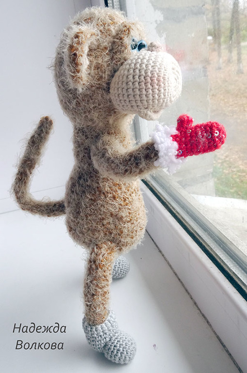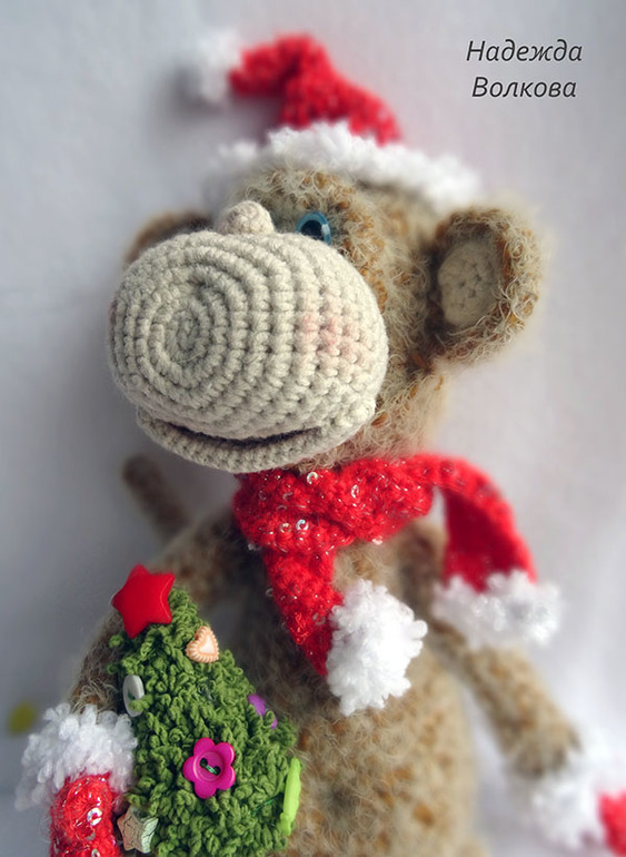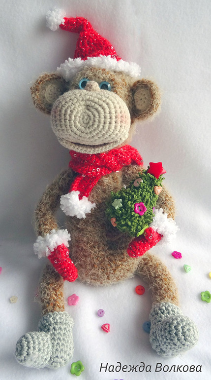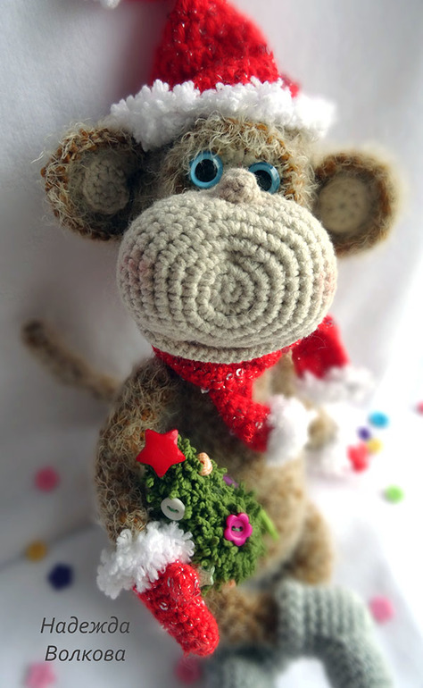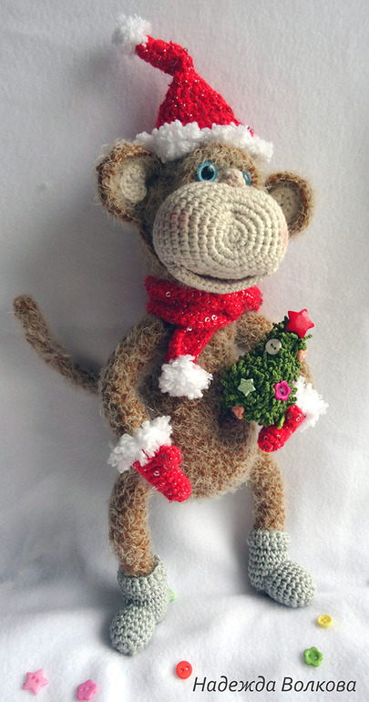 Связалась для души обезьянка! Она уже подготовилась к встрече НГ, потеплее оделась и елочку нарядила. Связана из пряжи камтекс трава стрейч, ушло 1,5 мотка, крючок 2,5. Стоит и сидит с опорой. Руки. ноги и хвост на проволочном каркасе, сгибаются. Ростиком обезьянка 27 см- стоя и 22 см сидя. Шапочка и шарфик съемные.