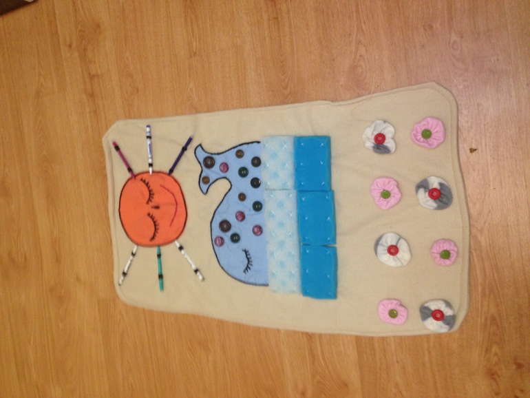 Немного расскажу, кому интересно: сначала идут пухлые цветочки и пуговки, потом ряд губки мягкие и жесткие белые, дальше кит тоже с пуговками, и последнее солнышко, под него нашиты крышки от молока простоквашино, сбоку карандашики.