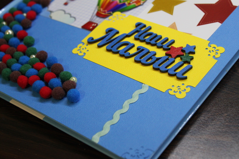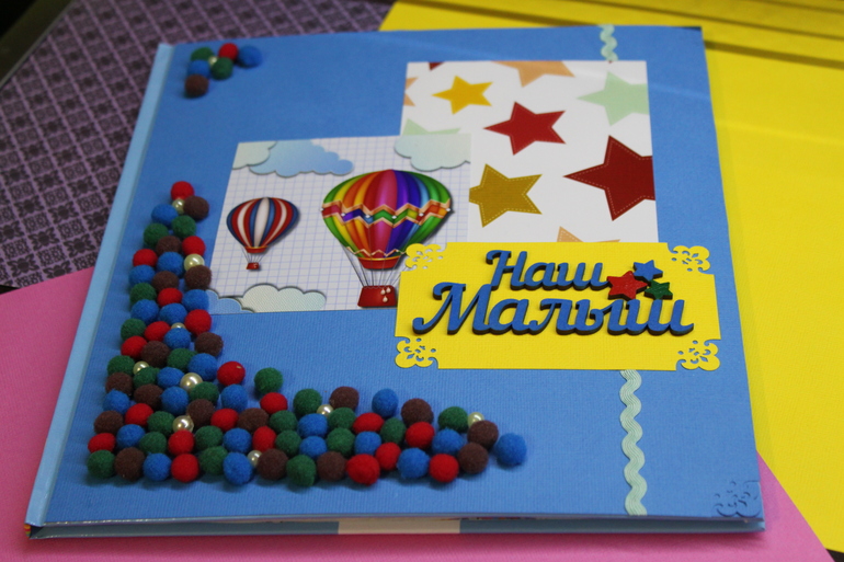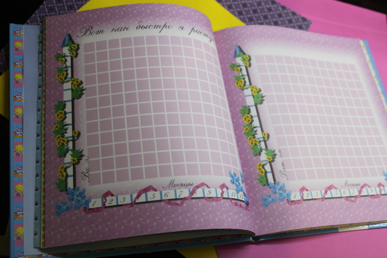 Фотоальбом первого года жизни. Внутри без скрап-наполнения, цветные странички для записей и фото. Размер 24х27 см.