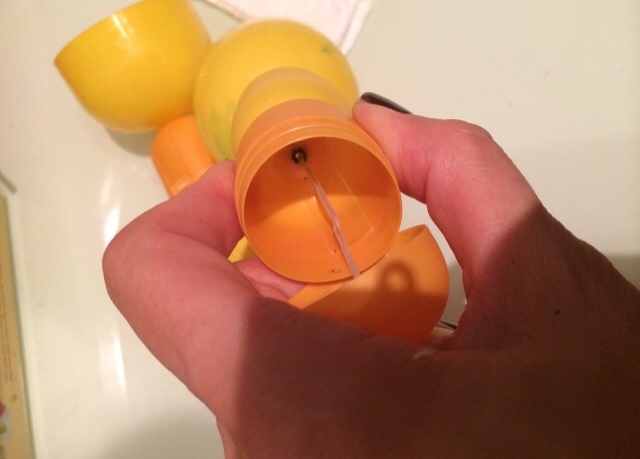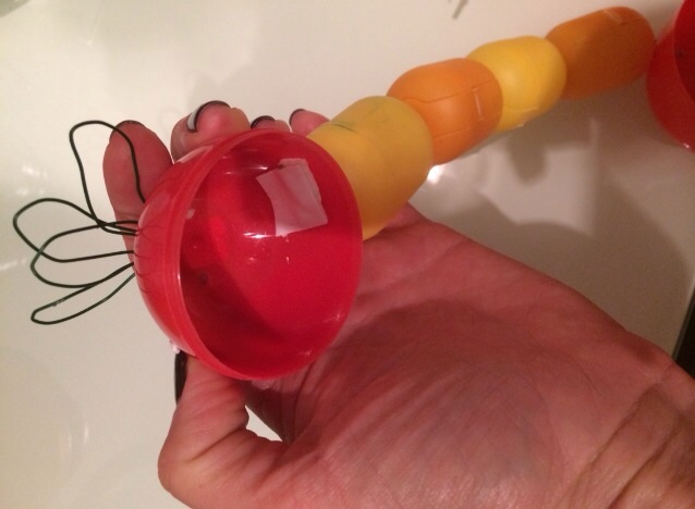 Зубочистку поджигаю от свечки и делаю дырочки на противоположных краях яйц, из которых делаем ноги и шею. Для яйца-головы дырка делается только в месте соединения с шеей. В яйце-туловище делаем 3 дырки для 2 ног и шеи. В половинках яиц-лап по одной дырочке. Все соединяем проволокой, но не медной, а более тонкой, пластичной. 1я проволока идет от лапы, через все ноги и заканчивается в туловище. Вторая проволока, по аналогии с первой, идет от второй лапы через ногу к туловищу, где и крепится. Третья проволока от туловища и до головы. На концах проволоки делаем узелочки - клубочки, и, для верности, заклеиваем эти клубочки скотчем. Итак, Лошарик собран. Осталось наделить его способностью передвигаться. Для этого берем 2 палочки /карандаша и соединяем их крест на крест под прямым углом так, чтобы для одной из палочек место соединения было ровно посередине, а для другой -примерно на 1/3 длины. Соединяем палочки крест на крест скотчем. К лапам, попе и голове Лошарика нам надо прикрепить нити и соединить их с получившмся крестом из палочек. Ну, с лапами вск легко - просто привязываем нити к проволоке между лапой и первым снизу Киндером. Что касается головы и попы, то , как вариант можно сделать дополнительные проколы и зафиксировать в них нити, но я решила добавить Лошарику немного лоска и украсить его хвостом и хохолком . Хвост я сделала из каких-то кусков гибкого пластика, Бог весть откуда взявшихся в кухонном ящике, а хохолок из той же проволоки, которую использовала для сборки Лошарика. Все это дело я посадила на двусторонний скотч, и им же и закрепила сверху. Скотч лучше брать мягкий, так как рельефные предметы он фиксирует лучше, чем обычный плоский. Две оставшиеся нити я закрепила, обвязав получившиеся хвост и хохолок. Одинаково обрезаем нити и привязываем к соответствующим концам крестика - лапы к той палке, которая делится наполовину, голову к короткой части второй палочки, хвост -к длинной части. Слишком длинные нитки будут постоянно путаться, поэтому достаточно, чтобы между головой и палочками нить была длинной не больше 20-30 см. Если нитки упорно сваливаются с палки, берем нож/лобзик и тд и делает желобок в районе того места, где должна держаться нить.